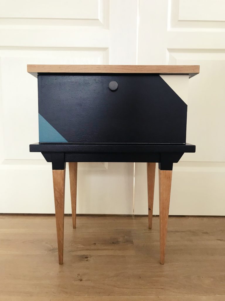 chevet années 60 revalorisé pour un look et des détails actuels en bois mat et noir chic…